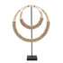 Diese auffällige Dekoration auf einem Ständer hat einen Platz in Ihrem Zuhause verdient! Auf einem Schrank, im Badezimmer oder sogar auf einer überdachten Terrasse oder im Garten - sie macht überall eine gute Figur. Die beiden Kreise sind mit Muscheln, Knochen, Holzperlen und Baumwollschnüren verziert. Alles von echten balinesischen Kunsthandwerkern hergestellt.